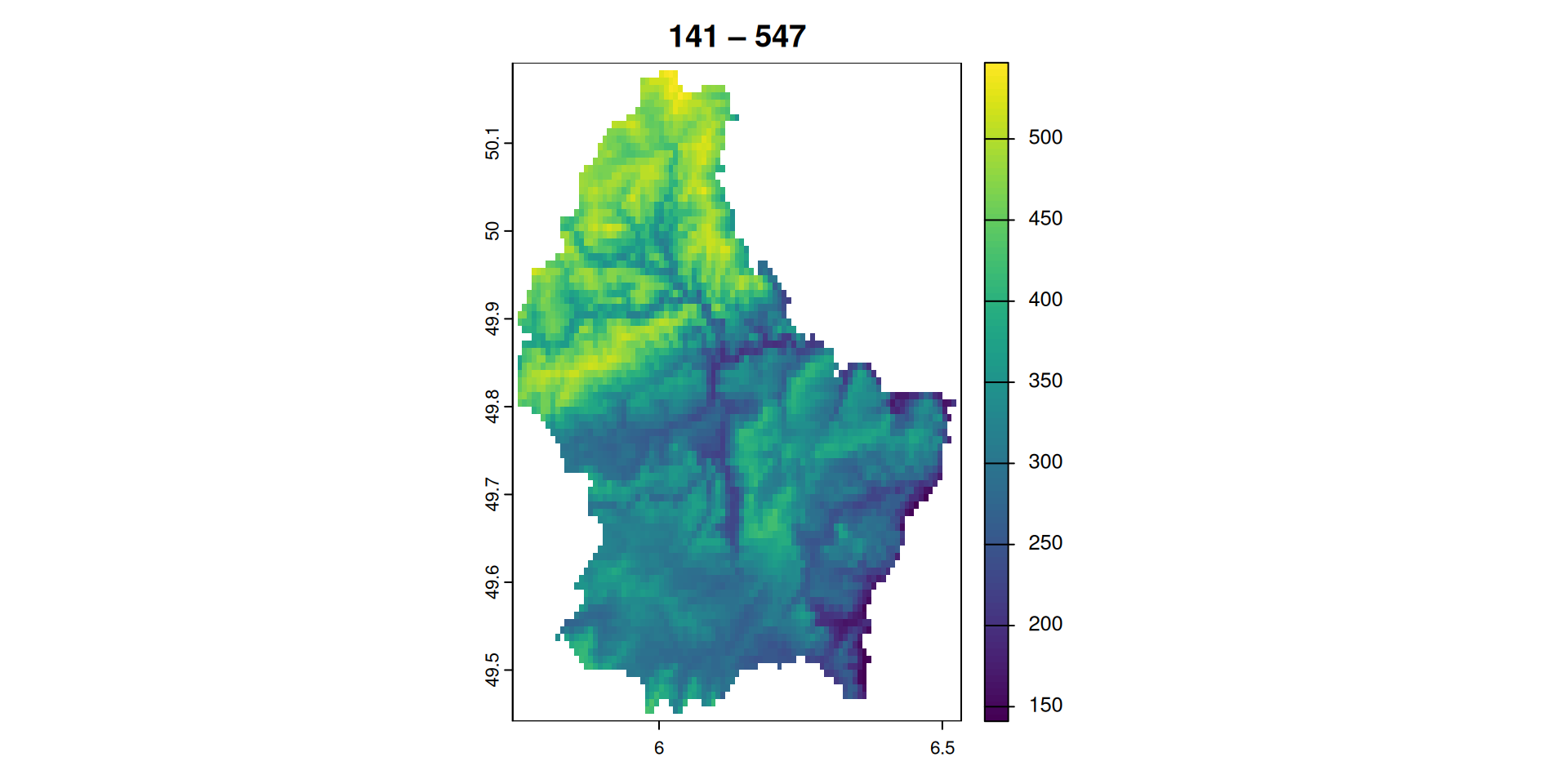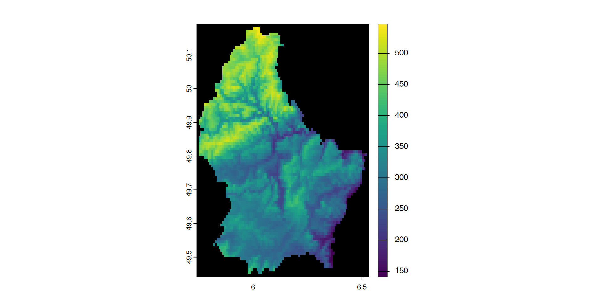 plot(elev_back, colNA = "black")Note that the maximum elevation values are now NA